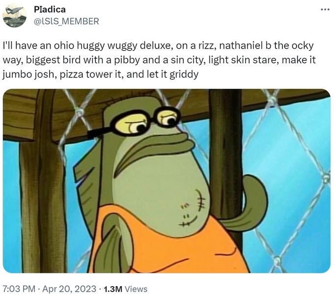 ’s “In my zombie era,” which discusses brainrot culture through a zombie’s brainrot narrative. For example:Every day I spawn in. Emerge wriggling out my skibidi bolus of slime. Whence and where? Lol. Idk. Vibes here be mad shady fr…Here’s a normal day in the life of a mf with zero inner monologue and zero ability to speak. From 6 to 7 am I bedrot, or I would if I had a bed. Instead I simply rot. Goblincore. Mushroomcore. Livid colonies of fungus going feral around my wounds fr. From 7 to 8 am I bedrot. From 8 to 9 am I bedrot. From 9 to 10 am I flail my arms around while making strangled hacking noises. No cap this is such a dope part of my morning routine. From 10 am until lunch I enter grind mode, by which I mean wandering in loose circles over the ruins.