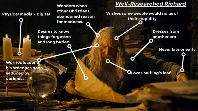 He is skeptical of squishes and a keyboard apologist with a hair trigger. Like Gandalf, he feels he is plagued by foolish companions that he must counsel. His “church leadership” is always at risk of compromising their theological rigor and integrity. No matter what church Richard attends, he must maintain a critical distance, always monitoring whether he agrees with what’s being taught. If he doesn’t, they’ll be hearing about it.
