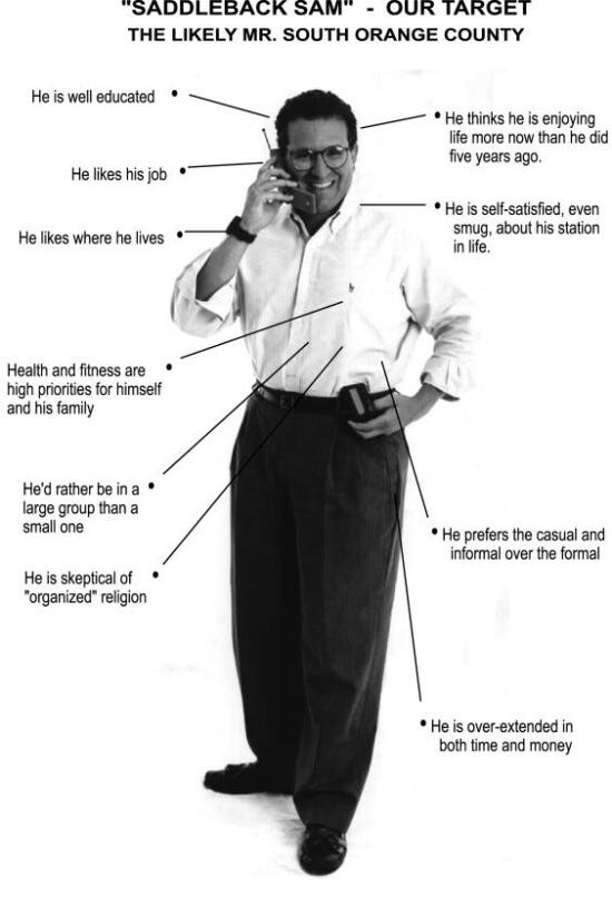 Saddleback Sam was the result of hundreds of conversations Warren had with California locals, trying to understand their motivations for going to church. By distilling his target parishioner into a simple image, Warren was able to focus his initial church planting efforts and tailor his outreach.