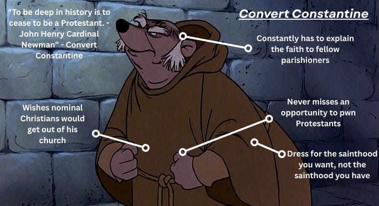 While this sort of Catholic-on-Orthodox fighting will occur occasionally, Constantine’s most telling trait is his four word motto: Always Dunk On Protestants. This can take many forms. The unrelenting soft pressure campaign: “You’re going to convert. It’s just a matter of time.” The not-so-subtle dig, “Wouldn’t you say Protestantism’s ‘deep history and tradition’ is a bit of a stretch?” The pwn with facts and logic: “If sola scriptura is true, then why couldn’t the Reformers agree on the meaning of communion?”