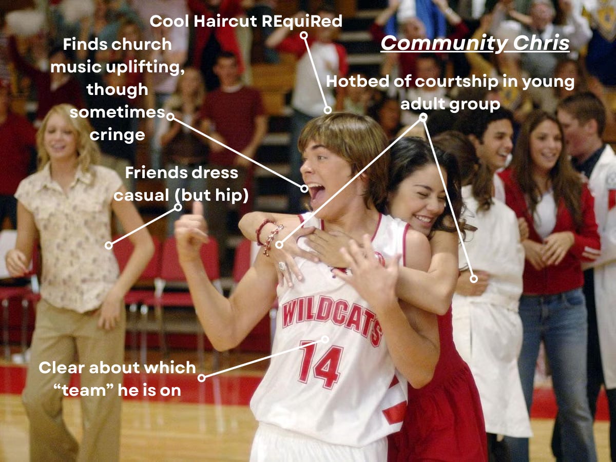 Chris might admit that the substance of his church service is not great (just like Troy from HSM wouldn’t say he loves high school because of chemistry class). But Chris loves his church because he loves the people. He would rather go to a subpar service with his friends than the perfect service without them.